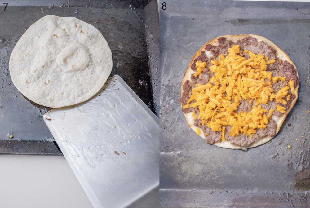 - Note: For best results, use a griddle or two pans if possible. Using two pans allows you to brown the meat on one surface and crisp the tortilla on another, since the meat releases some liquid during cooking and the tortilla crisps better on a dry or oiled surface. A griddle gives you more space and better browning. One pan will also work — just wipe off excess liquid before flipping.